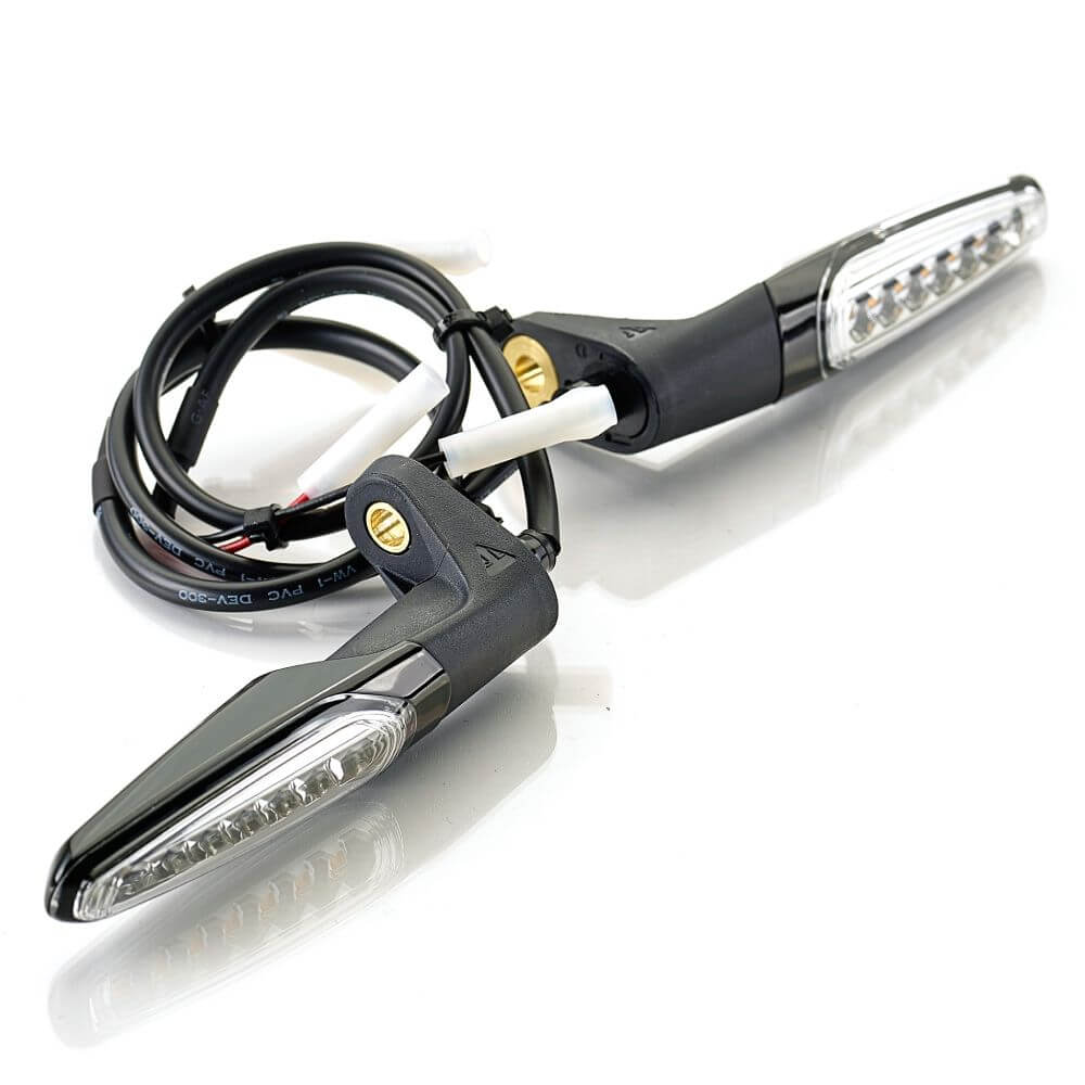 A pair of LED indicators featuring a scrolling pattern across 7 high power LEDs. Housed in a cast aluminium body with black finish and moulded base with logo detail.