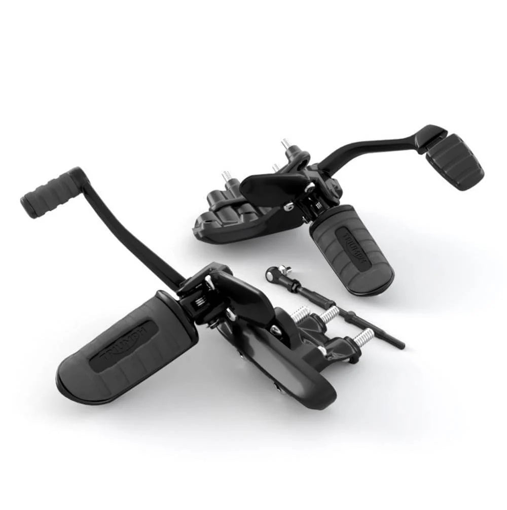 Enhance your riding ergonomics with the Triumph Black Forward Foot Controls kit (A9770249). This kit shifts your foot position forward by 245mm from the standard setup, offering three additional horizontal adjustments (-25mm, 0mm, +25mm) to fine-tune comfort and control. Please note, footrest rubbers are not included and must be purchased separately. Ideal for riders seeking precise customization to improve posture and riding experience.